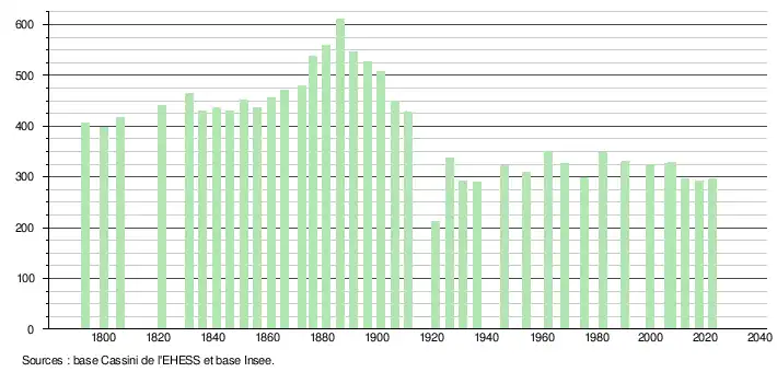 L'évolution du nombre d'habitants est connue à travers les recensements de la population effectués dans la commune depuis 1793. Pour les communes de moins de 10 000 habitants, une enquête de recensement portant sur toute la population est réalisée tous les cinq ans, les populations de référence des années intermédiaires étant quant à elles estimées par interpolation ou extrapolation[21]. Pour la commune, le premier recensement exhaustif entrant dans le cadre du nouveau dispositif a été réalisé en 2007[22].