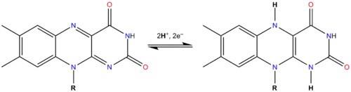 où Flox est la forme oxydée de la flavine, FlredH2 la forme totalement réduite (par l'addition de deux atomes d'hydrogène) et FlH• la forme semiquinone (addition d'un seul atome d'hydrogène).