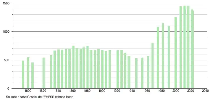 L'évolution du nombre d'habitants est connue à travers les recensements de la population effectués dans la commune depuis 1793. Pour les communes de moins de 10 000 habitants, une enquête de recensement portant sur toute la population est réalisée tous les cinq ans, les populations de référence des années intermédiaires étant quant à elles estimées par interpolation ou extrapolation[17]. Pour la commune, le premier recensement exhaustif entrant dans le cadre du nouveau dispositif a été réalisé en 2006[18].
