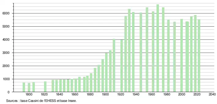 L'évolution du nombre d'habitants est connue à travers les recensements de la population effectués dans la commune depuis 1793. Pour les communes de moins de 10 000 habitants, une enquête de recensement portant sur toute la population est réalisée tous les cinq ans, les populations de référence des années intermédiaires étant quant à elles estimées par interpolation ou extrapolation[30]. Pour la commune, le premier recensement exhaustif entrant dans le cadre du nouveau dispositif a été réalisé en 2007[31].