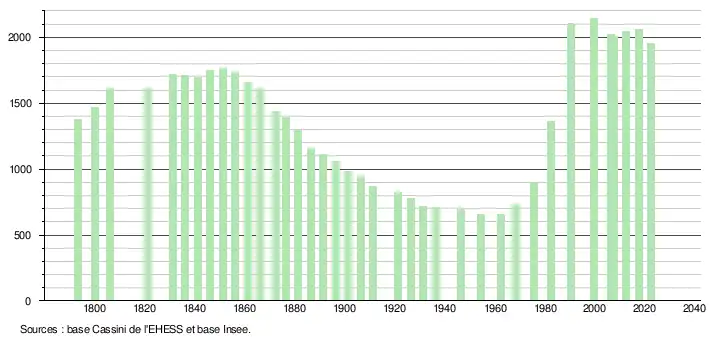 L'évolution du nombre d'habitants est connue à travers les recensements de la population effectués dans la commune depuis 1793. Pour les communes de moins de 10 000 habitants, une enquête de recensement portant sur toute la population est réalisée tous les cinq ans, les populations de référence des années intermédiaires étant quant à elles estimées par interpolation ou extrapolation[24]. Pour la commune, le premier recensement exhaustif entrant dans le cadre du nouveau dispositif a été réalisé en 2007[25].