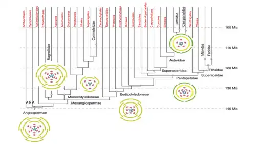 Les plus anciens fossiles de plantes à fleurs sont Archaefructus, probablement aquatique et datée d'il y a 120 millions d'années (début du Crétacé). Cette fleur découverte en Chine n'avait ni pétales ni sépale mais des carpelles, et des étamines dispersés le long d'une tige, non ancrés sur un même point[14]. Montsechia vidalii découverte dans les Pyrénées espagnoles est également une plante aquatique datant de 130 millions d'années[15]. Par la méthode phylogénétique de la reconstitution des états ancestraux, des chercheurs ont fait le portrait-robot[16] du plus ancien ancêtre commun de toutes les fleurs, il y a 140 millions d'années, qui s'avère être une fleur hermaphrodite dont la majorité des pièces florales ne sont pas insérées en spirale mais en verticille[17], ce qui contredit la théorie euanthe du botaniste américain Charles Edwin Bessey qui suggère que les Angiospermes sont monophylétiques, dérivant d'une fleur primitive de type Magnolia[11].