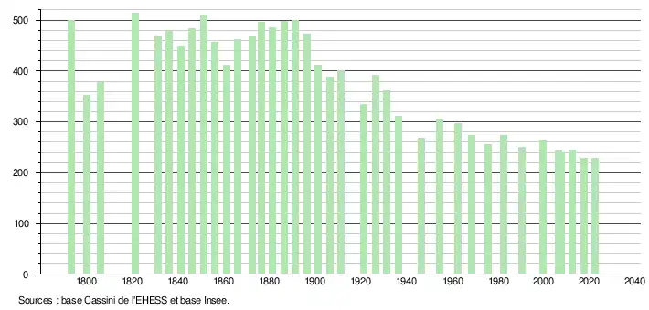 L'évolution du nombre d'habitants est connue à travers les recensements de la population effectués dans la commune depuis 1793. Pour les communes de moins de 10 000 habitants, une enquête de recensement portant sur toute la population est réalisée tous les cinq ans, les populations de référence des années intermédiaires étant quant à elles estimées par interpolation ou extrapolation[13]. Pour la commune, le premier recensement exhaustif entrant dans le cadre du nouveau dispositif a été réalisé en 2007[14].