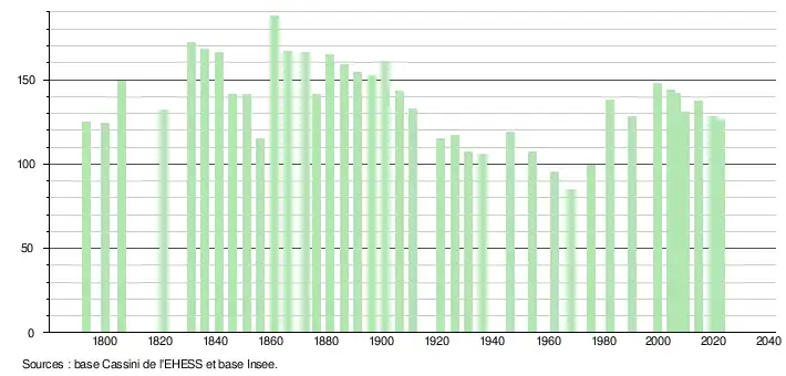 L'évolution du nombre d'habitants est connue à travers les recensements de la population effectués dans la commune depuis 1793. Pour les communes de moins de 10 000 habitants, une enquête de recensement portant sur toute la population est réalisée tous les cinq ans, les populations de référence des années intermédiaires étant quant à elles estimées par interpolation ou extrapolation[20]. Pour la commune, le premier recensement exhaustif entrant dans le cadre du nouveau dispositif a été réalisé en 2004[21].