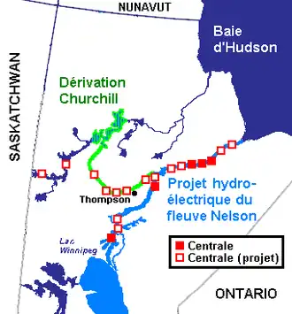 De plus, le fleuve Churchill, qui se trouve à environ 160 km au nord, est dérivé vers le fleuve Nelson depuis 1977. Du lac Southern Indian sur le fleuve Churchill, le Nelson reçoit en moyenne 760 m3/s d’eau, soit 60 % du débit naturel du Churchill dont la superficie du bassin versant du cours supérieur s’élève à environ 230 000 km2. Le débit du fleuve Nelson aménagé atteint maintenant environ 3 130 m3/s. L’exutoire naturel du lac Winnipeg a aussi été aménagé afin d'augmenter la production hydroélectrique des centrales du Nelson en hiver. Depuis 1979, le cycle naturel du lac Winnipeg a donc été inverti : le lac atteint son niveau maximal à l’automne et son niveau minimal au printemps.