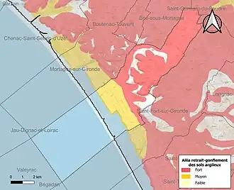 Le retrait-gonflement des sols argileux est susceptible d'engendrer des dommages importants aux bâtiments en cas d’alternance de périodes de sécheresse et de pluie. 46,7 % de la superficie communale est en aléa moyen ou fort (54,2 % au niveau départemental et 48,5 % au niveau national). Sur les 264 bâtiments dénombrés sur la commune en 2019, 259 sont en aléa moyen ou fort, soit 98 %, à comparer aux 57 % au niveau départemental et 54 % au niveau national. Une cartographie de l'exposition du territoire national au retrait gonflement des sols argileux est disponible sur le site du BRGM[16],[17].