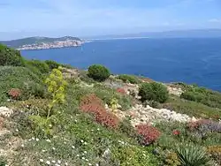 Le long des côtes, caractérisées par des espèces psammophiles, on peut distinguer plusieurs bandes : plage, antedunes, dunes, rétrodunes, rochers et falaises rocheuses, et enfin garrigue des zones rocheuses arides.