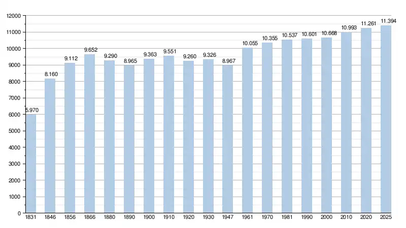 Les chiffres des années 1831 à 1970 tiennent compte des chiffres des anciennes communes fusionnées.