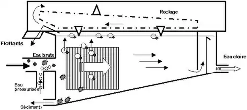 Le flottateur à air dissous est un appareil de traitement des eaux usées qui permet la séparation des matières en suspension. Cette séparation s'effectue grâce à l'injection de microbulles d'air dans l'eau à traiter : ces microbulles en remontant à la surface entraînent dans ce mouvement les particules qui sont ensuite écrémées par un racleur de surface, puis retirées des eaux à traiter.
