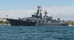 | Croiseur lance-missiles | проекта 1164 «Атлант» (projet 1164 Atlas, appelé par l'OTAN la classe Slava) | 121 | Construit de 1976 à 1983, équipé de 16 lance-missile anti-navires Bazalt. Coulé le par les forces ukrainiennes. | ||