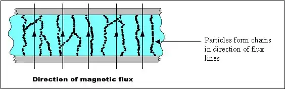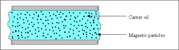 Au repos, les particules sont suspendues à l'intérieur du fluide porteur et distribuées de façon aléatoire en suspension. Lorsqu'un champ magnétique ou électrique est appliqué, les particules microscopiques s'alignent le long des lignes de flux magnétique ou de flux électrique. Ceci augmente la viscosité du fluide. Les images suivantes montrent le comportent d'un fluide magnétorhéologique avant et après l'application d'un champ magnétique.