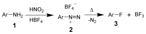 La diazotation se fait à l'aide de fluorure de nitrosyle généré in situ par réaction entre le fluorure d'hydrogène et le nitrite de sodium. Le fluorure de nitrosyle réagit avec l'amine aromatique pour former le sel fluorure d'arènediazonium. La décomposition finale donne le fluorobenzène avec dégagement de diazote[3].