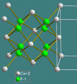 La fluorite est un assemblage d'ions Ca2+ et F−. Les anions F− sont deux fois plus nombreux que les cations Ca2+.