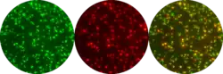 Pour analyser les résultats, on utilisera un lecteur automatisé FluoroSpot équipé de filtres séparés pour la fluorescence verte et rouge. L’analyse se fera par un logiciel qui lira les taches fluorescentes « simples » vertes et rouges. La « double » sécrétion se révèlera par un système de co-localisation des taches. Visuellement, les taches représentant les cellules qui auront sécrétées les deux cytokines apparaîtront en jaune (recouvrement des taches vertes et rouges cf. figure 2). La fréquence des cellules sécrétrices « simples » ou « doubles » sera déterminée en comptabilisant le nombre de taches dans les cultures de cellules stimulées et celles obtenues sans stimulus « contrôles ».