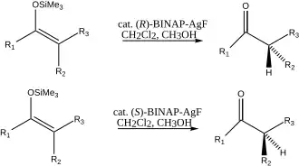 Une autre méthode de synthèse organique utilisant le fluorure d'argent(I) est la protonation énantiosélective d'éther de silylénol catalysée par le complexe BINAP-AgF[22] : :1546