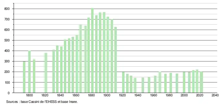L'évolution du nombre d'habitants est connue à travers les recensements de la population effectués dans la commune depuis 1793. Pour les communes de moins de 10 000 habitants, une enquête de recensement portant sur toute la population est réalisée tous les cinq ans, les populations de référence des années intermédiaires étant quant à elles estimées par interpolation ou extrapolation[24]. Pour la commune, le premier recensement exhaustif entrant dans le cadre du nouveau dispositif a été réalisé en 2006[25].
