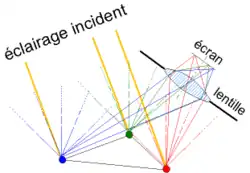 Donc, si l'on met un écran sur le plan focal d'une lentille ou d'un miroir courbe, chaque tache correspondra à la lumière captée venant d'une même direction donc venant d'un même objet (ou d'objets alignés). Plutôt que de mettre un écran, on met en général un miroir, qui prend moins de place et permet de rallonger le trajet optique, donc l'agrandissement de l'image. Plus l'ouverture de l'instrument d'optique est grand, plus on collectera de lumière, plus l'intensité sera importante, mais plus on s'éloignera des conditions de Gauss, moins la focalisation sera parfaite (image floue).