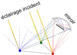 | Principe de la chambre noire : les rayons qui passent par le trou proviennent de différentes directions, donc de différents points de l'objet observé | Chambre noire double avec miroirs : première approche de la focalisation | Focalisation par un miroir courbe : une extension de la chambre noire |