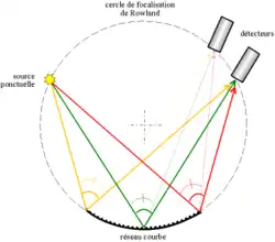 On a donc focalisé les rayons. Le cercle de focalisation (celui sur lequel se trouvent le réseau, la source et le détecteur) s'appelle le cercle de Rowland.