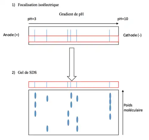 Afin d’étudier un grand nombre de protéines en même temps, la focalisation isoélectrique est souvent combinée à une électrophorèse dénaturante (gel de SDS), qui sépare les molécules selon leur poids moléculaire. Cette technique, l’électrophorèse bidimensionnelle (gel 2D) a été introduite par Patrick H. O’Farrell en 1975 et devrait permettre d’analyser au maximum 5 000 protéines[13]. L’utilisation de ces deux techniques de séparations permet une grande résolution puisque le pI et le poids moléculaire d’une molécule ne dépendent pas l’un de l’autre. La première dimension du gel 2D est toujours la focalisation isoélectrique et par la suite le gel de SDS[14].