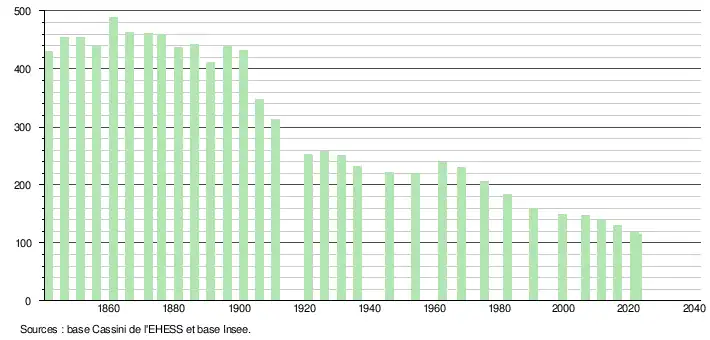 L'évolution du nombre d'habitants est connue à travers les recensements de la population effectués dans la commune depuis 1841. Pour les communes de moins de 10 000 habitants, une enquête de recensement portant sur toute la population est réalisée tous les cinq ans, les populations de référence des années intermédiaires étant quant à elles estimées par interpolation ou extrapolation[14]. Pour la commune, le premier recensement exhaustif entrant dans le cadre du nouveau dispositif a été réalisé en 2006[15].