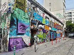 Le grand mur aveugle du bâtiment qui longe la rue Dénoyez est depuis plusieurs années entièrement recouverts de graffitis, souvent artistiques, en perpétuel renouvellement.
