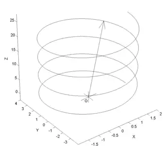 Graphe de la courbe paramétrée r(t) = (2 cos t, 4 sin t, t), le vecteur représentant la valeur de la fonction pour t ≈ 19,5.