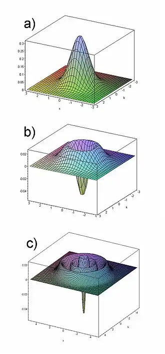 où ψ est la fonction d'onde définie dans l'espace des positions, et x et p sont la position et l'impulsion, mais pourraient être n'importe quelle paire de variables conjuguées (par exemple parties réelles et imaginaires du champ électrique ou fréquence et temps d'un signal). Notez que W(x,p) peut être non-nulle dans des domaines où la fonction d'onde s'annule ("battements").