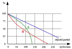 Les courbes de FTM caractérisant un objectif photographique comportent au moins deux courbes[14],[15]: