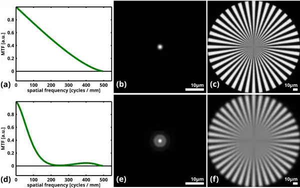 Les objectifs photographiques présentent une FTM maximale pour les ouvertures moyennes (f/5,6). La FTM est plus faible pour les grandes ouvertures (f/1,4, f/2) du fait des aberrations, et pour les petites ouverture du fait de la diffraction. Les fabricants d'objectifs limitent généralement l'ouverture à f/16 ou f/22 (f/32 pour les grands formats). La diffraction affecte moins les grands capteurs (à définition égale) car les pixels sont plus grands et que la taille de la tache de diffraction ne dépend que de l'ouverture.