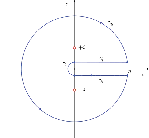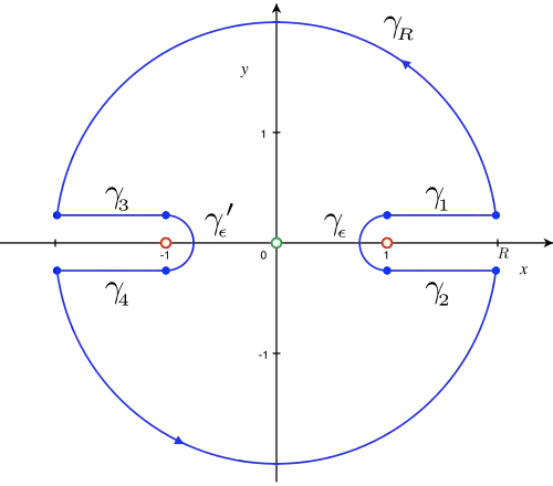 La fonction f définie par a trois singularités[9] : les deux points de branchement (±1) et le pôle simple (l'origine) qui est la seule singularité d'indice non nul par rapport au contour ; à la limite et , le théorème des résidus nous donne donc :