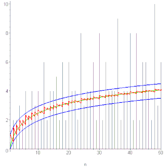 La fonction d est très irrégulière : elle prend la valeur 2 pour premier, et prend aussi des valeurs arbitrairement grandes (par exemple N + 1 pour n = 2N) . Mais en moyenne de Cesàro : .
