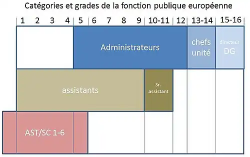- La fonction publique communautaire était initialement divisée en catégories hiérarchiques A (administrateurs/universitaires), B (assistants), C (secrétaires/commis) et D (manutentionnaires) Il s'y ajoutait un cadre LA pour les linguistes. Les catégories sont divisées en quatre (D), cinq (B/C) ou huit (A/LA) grades. Chaque grade est divisé entre cinq et huit échelons. Les directeurs occupent le grade A2, les directeurs-généraux le grade A1.