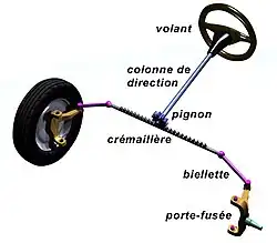 Le système de direction permet d'orienter l'automobile dans la direction souhaitée. Ce système se compose entre autres d'un dispositif de commande — généralement un volant circulaire — permettant aux mains du conducteur d'appliquer un couple sur le système de direction. Le volant, situé face au conducteur, est en général réglable pour s'adapter au mieux à la morphologie et aux habitudes des conducteurs. La transmission du mouvement imprimé par le conducteur se fait sur la colonne de direction fixée au centre du volant de commande ; elle transmet le couple aux biellettes de direction (agissant directement sur les roues) par l'intermédiaire d'un boîtier de direction. Ce boîtier est soit un système pignon s'engrenant sur une crémaillère, soit un système à vis avec circulation de billes.