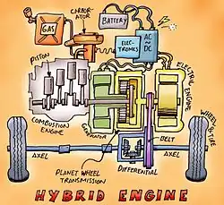 Comme son nom l'indique, une motorisation hybride est une association entre deux types de motorisation afin d'en combiner les points forts et de gommer leurs défauts. Les deux types de moteurs sont installés sur le véhicule, un système informatique embarqué allié à une électronique de puissance gère leur complémentarité, ainsi que les ressources disponibles en fonction des demandes et des contraintes[10].