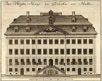 D'emblée August Hermann Francke ouvrit une « école de charité », d'abord installée dans une salle de la sacristie. Les enfants reçurent d'abord leurs leçons d'un étudiant en théologie de l’université de Halle. La bonne réputation de cette petite école fit que le nombre d’écoliers grimpa rapidement, et quelques semaines plus tard, des bourgeois de Glaucha y envoyaient leurs enfants moyennant une modeste contribution. À l’été 1695, les cours étaient déjà suivis par 50 écoliers. Et comme un nombre croissant de familles aisées voulaient y envoyer leurs enfants, il finit par ouvrir à la Pentecôte de 1695 un Pædagogium destiné à l’instruction et à l’éducation d’enfants de la noblesse et la haute bourgeoisie. Puis en 1697 ce fut une école de latin pour les enfants de la bourgeoisie se destinant à une carrière académique. L’enseignement était toujours assuré par des étudiants, qui bénéficiaient en contrepartie d’une chambre, de bois de chauffe et d’une bourse de 16 groschen[3]. Devant la multiplication du nombre d’enfants déshérités ou orphelins abandonnés à la misère, Francke décida de les scolariser moyennant une contribution des familles, et c'est ainsi que l’idée d'un orphelinat prit forme. L'électeur lui accorda divers privilèges, comme l'exemption des droits d’accise, d’octroi et de passage, et grâce à de nouvelles donations, il put en 1698 poser la première pierre de la nouvelle institution. Au mois d’, Francke inaugurait le bâtiment, qui était en même temps le siège de sa fondation.