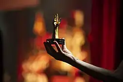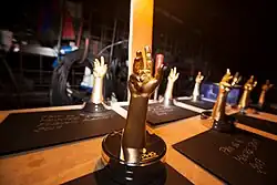 Le trophée[39] du Grand Prix d'Horlogerie de Genève a été créé par le graphiste et designer genevois Roger Pfund, qui a également dessiné notamment le passeport suisse et de nombreux billets de banque. La main est le symbole du savoir-faire et de la maîtrise, essentiels dans les métiers de l'horlogerie. Pour ce trophée, l'artiste s'est inspiré de la fresque de la chapelle Sixtine, peinte par Michel-Ange, où Dieu effleure la main tendue d'Adam pour lui donner la vie. il symbolise également la mémoire et la transmission du savoir. Les trophées remis aux lauréats des différents prix sont réalisés en bronze doré, par l'entreprise suisse TEC Groupswiss[40]