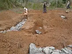 Pour construire une fondation en moellons, une tranchée étroite est creusée sous le seuil du gel. Le fond de la tranchée devrait idéalement être légèrement incliné vers une sortie. Des drains sont ensuite placés au fond de la tranchée sur un lit de galets de rivière protégées par un tissu filtrant. La tranchée est ensuite remplie de pierre tamisée (généralement 1-1/2") ou de gravats recyclés. Une poutre en béton armé peut être coulée à la surface afin de fournir une garde au sol à la structure.
