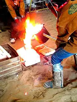 - Torcher un moule : projeter du sable très humide sur le joint du moule pour éviter les fuites de métal à la coulée.