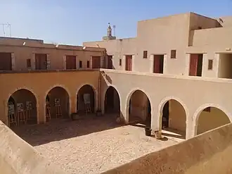 L'entrée du monument se fait par un vestibule en couloir muni d'une grande porte en bois à portillon, encadrée d’un appareil en pierre de taille. On y trouve latéralement des banquettes maçonnées et des escaliers du côté gauche qui mènent au premier étage[4]. Il donne accès à un vaste patio à ciel ouvert entouré de portiques à claveaux en grès coquillé, montés sur des piliers en calcaire. Ces derniers ouvrent sur des cellules couvertes en voûtes de plein cintre qui servaient de magasins réservés aux animaux des voyageurs et à leurs marchandises.