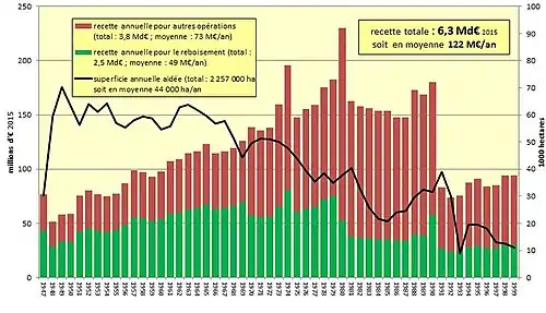 On voit également que le rapport de boisement/reboisement reste à peu près constant à 60 % de reboisement, soit environ 0,9 Mha de boisement et 1,2 Mha de reboisement. Compte-tenu d’un taux de réussite des plantations avoisinant les 80%, l’augmentation de la surface boisée par le FFN est de l’ordre de 0,8 Mha. Cette valeur est à rapprocher de l’augmentation très importante de 5 Mha de la surface boisée en France durant la même période (1945 : 11 Mha et 2010 : 16 Mha)[13]. Ainsi ce sont très majoritairement des boisements spontanés dus à la déprise agricole et à l’exode rural qui se sont installés ; pour un 1 ha planté artificiellement, environ 5 ha de friches se sont boisés naturellement.