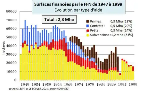 Parmi les aides du FFN, ce sont les subventions octroyées à des petites surfaces qui sont majoritaire (53%). Ainsi ce sont près de 1,9 Mha de « timbres-poste » d’une surface de 1 à 2 ha qui ont bénéficié du FFN[8], ce qui peut constituer actuellement un handicap en termes de gestion et d’exploitation. Concernant la nature des propriétaires, ce sont plus de 75% de surfaces appartenant à des propriétaires privés qui ont bénéficié des aides du FFN[14].