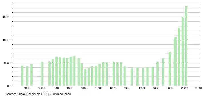 L'évolution du nombre d'habitants est connue à travers les recensements de la population effectués dans la commune depuis 1793. Pour les communes de moins de 10 000 habitants, une enquête de recensement portant sur toute la population est réalisée tous les cinq ans, les populations de référence des années intermédiaires étant quant à elles estimées par interpolation ou extrapolation[20]. Pour la commune, le premier recensement exhaustif entrant dans le cadre du nouveau dispositif a été réalisé en 2007[21].