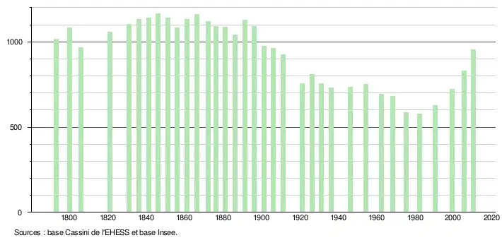 L'évolution du nombre d'habitants est connue à travers les recensements de la population effectués dans la commune depuis 1793. À partir du , les populations légales des communes sont publiées annuellement dans le cadre d'un recensement qui repose désormais sur une collecte d'information annuelle, concernant successivement tous les territoires communaux au cours d'une période de cinq ans. Pour les communes de moins de 10 000 habitants, une enquête de recensement portant sur toute la population est réalisée tous les cinq ans, les populations légales des années intermédiaires étant quant à elles estimées par interpolation ou extrapolation[9]. Pour la commune, le premier recensement exhaustif entrant dans le cadre du nouveau dispositif a été réalisé en 2005[10],[Note 1].