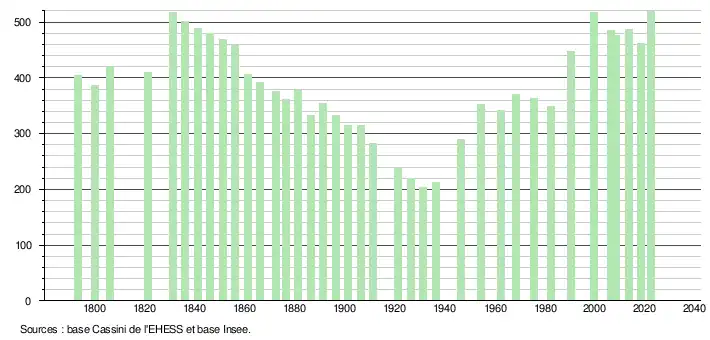 L'évolution du nombre d'habitants est connue à travers les recensements de la population effectués dans la commune depuis 1793. Pour les communes de moins de 10 000 habitants, une enquête de recensement portant sur toute la population est réalisée tous les cinq ans, les populations de référence des années intermédiaires étant quant à elles estimées par interpolation ou extrapolation[27]. Pour la commune, le premier recensement exhaustif entrant dans le cadre du nouveau dispositif a été réalisé en 2008[28].