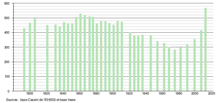 - ↑ Par convention dans Wikipédia, le principe a été retenu de n’afficher dans le tableau des recensements et le graphique, pour les populations légales postérieures à 1999, que les populations correspondant à une enquête exhaustive de recensement pour les communes de moins de 10 000 habitants, et que les populations des années 2006, 2011, 2016, etc. pour les communes de plus de 10 000 habitants, ainsi que la dernière population légale publiée par l’Insee pour l'ensemble des communes.