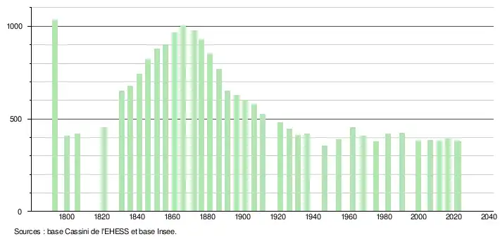 L'évolution du nombre d'habitants est connue à travers les recensements de la population effectués dans la commune depuis 1793. Pour les communes de moins de 10 000 habitants, une enquête de recensement portant sur toute la population est réalisée tous les cinq ans, les populations de référence des années intermédiaires étant quant à elles estimées par interpolation ou extrapolation[24]. Pour la commune, le premier recensement exhaustif entrant dans le cadre du nouveau dispositif a été réalisé en 2006[25].
