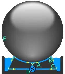 Au centre du bloc, une arrivée d'eau permet de le séparer de la sphère, laquelle glisse ainsi sur un film de liquide sous pression selon le principe du palier hydrostatique. Lubrifiée, il lui est possible de tourner sur le socle, et même d'être mise en mouvement d'une simple pression d'un doigt[1].