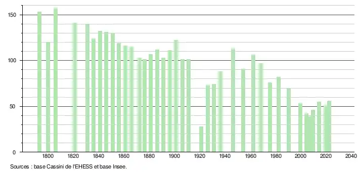 L'évolution du nombre d'habitants est connue à travers les recensements de la population effectués dans la commune depuis 1793. Pour les communes de moins de 10 000 habitants, une enquête de recensement portant sur toute la population est réalisée tous les cinq ans, les populations de référence des années intermédiaires étant quant à elles estimées par interpolation ou extrapolation[24]. Pour la commune, le premier recensement exhaustif entrant dans le cadre du nouveau dispositif a été réalisé en 2004[25].