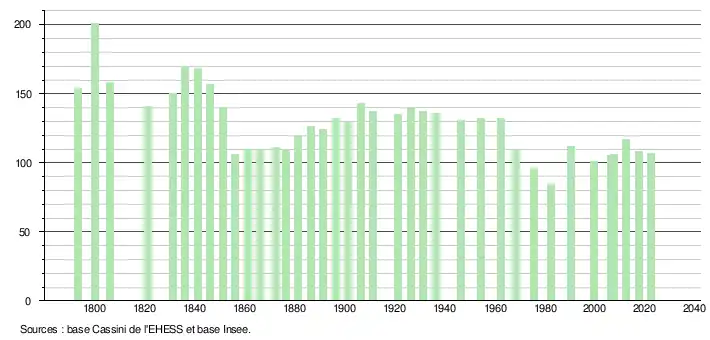L'évolution du nombre d'habitants est connue à travers les recensements de la population effectués dans la commune depuis 1793. Pour les communes de moins de 10 000 habitants, une enquête de recensement portant sur toute la population est réalisée tous les cinq ans, les populations de référence des années intermédiaires étant quant à elles estimées par interpolation ou extrapolation[35]. Pour la commune, le premier recensement exhaustif entrant dans le cadre du nouveau dispositif a été réalisé en 2007[36].